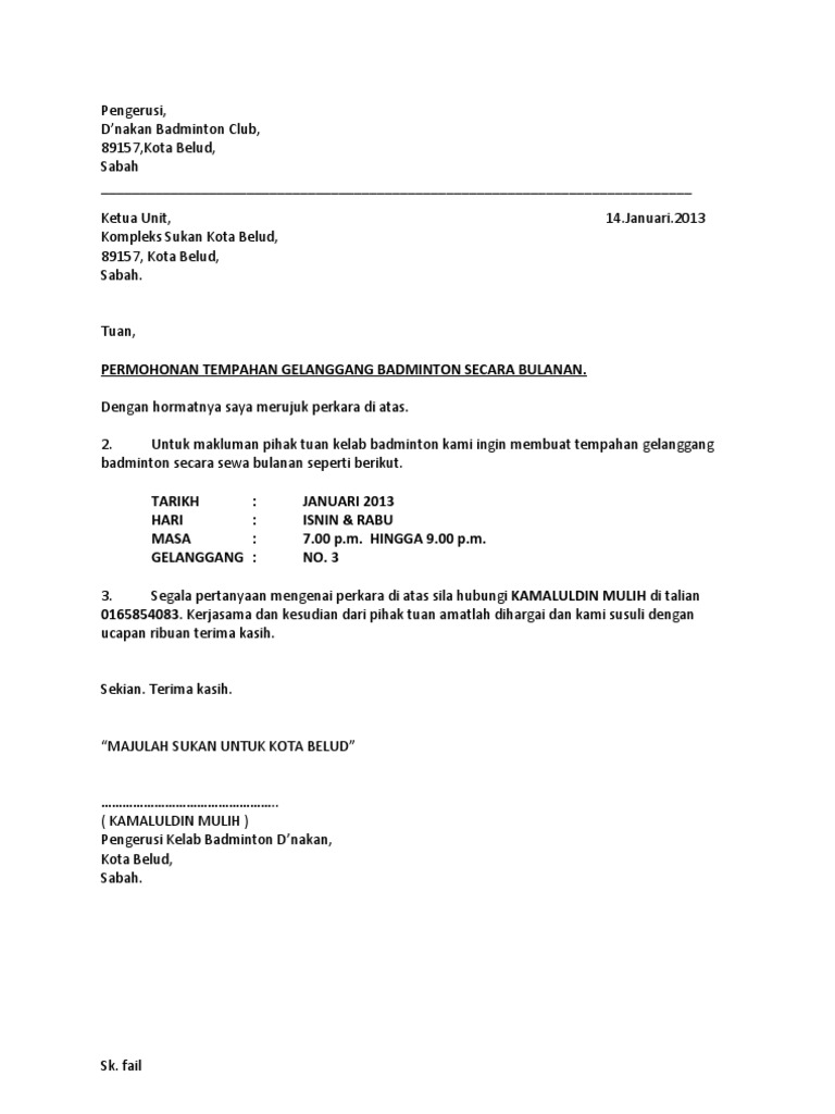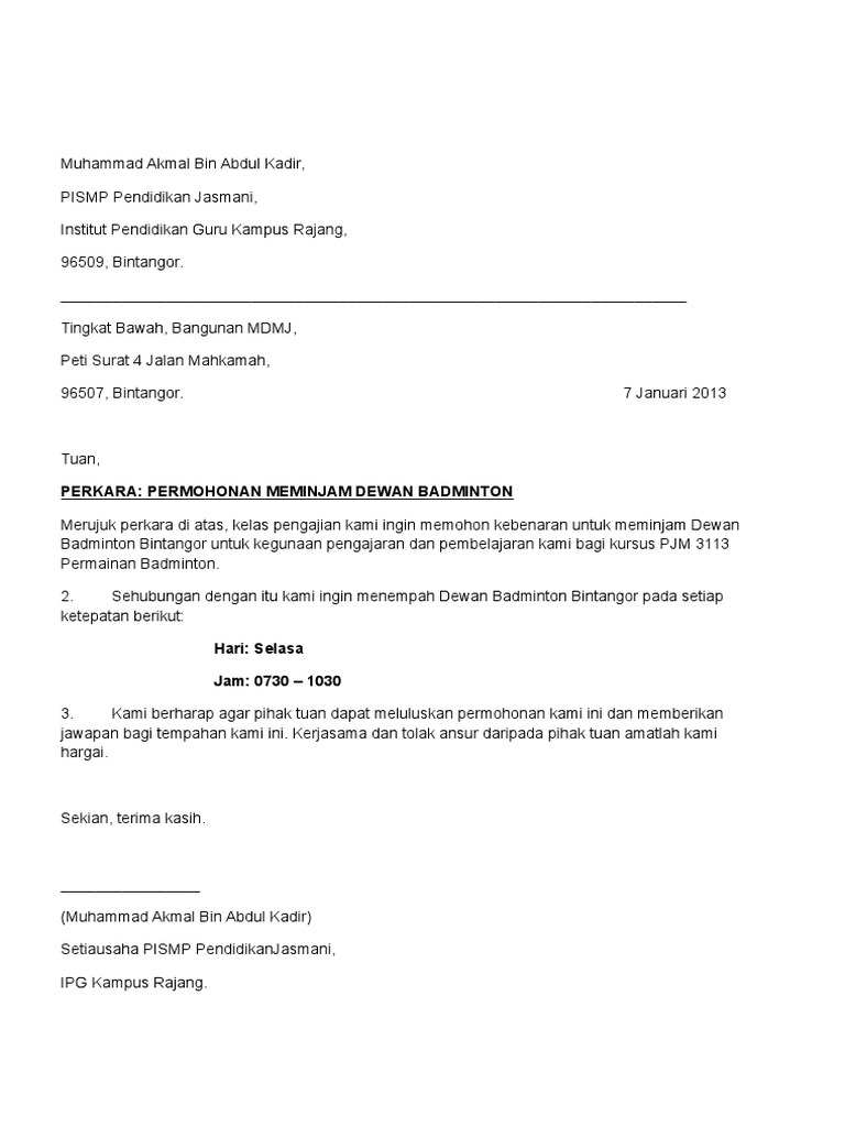 Contoh Surat Mohon Sewa Dewan Badminton